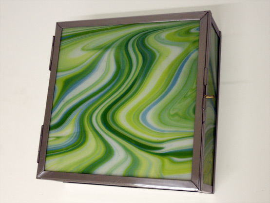 Box light with unique handmade glass panels. Available as enclosed lamps or as up and down lighters.