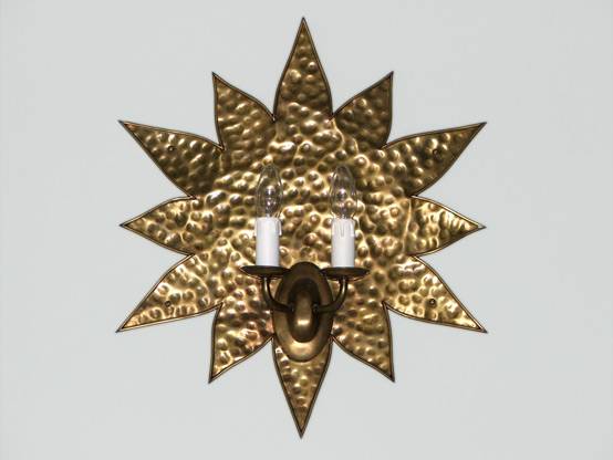 Hand worked brass wall lights, with single pendant lamp. MMW002: Sun wall sconce, MMW003: Star wall sconce, MMW004: Crescent wall sconce, MMW005: Moon wall sconce